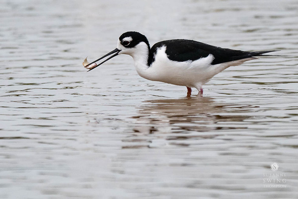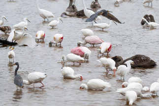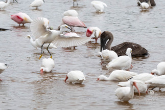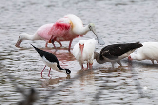I couldn't believe the collection nor how numerous it was. Pelicans and Great Egrets were flying in and out. Just as I would focus my attention on one, in would fly a Snowy Egret. Meanwhile, just across the pond, another Snowy Egret was going after a Little Blue Heron, evidently informing the Little Blue Heron that this little patch was already taken. There were flocks of White Ibises and at least nine Roseate Spoonbills in that marsh, and a new lifer* for me -- Black-necked Stilts.